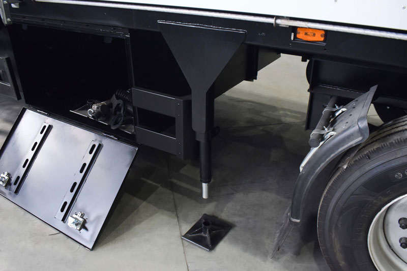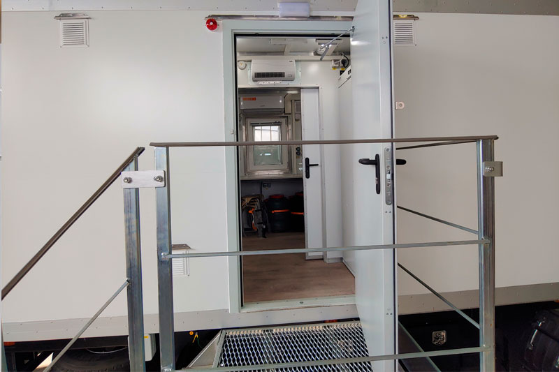 Для удобства и безопасности эксплуатации жилой прицеп-вагон-дом оснащён рядом продуманных решений. На входной группе установлена металлическая лестница-площадка с регулируемой высотой и перилами, которая при транспортировке убирается в подвесной рундук. Стабильность установки обеспечивают регулируемые стояночные домкраты, позволяющие компенсировать перепады высот на площадке. Для защиты предусмотрены два молниеотвода, хранящиеся в транспортном положении по бокам фургона. Дополнительные подвесные рундуки используются для хранения: один содержит три контейнера для мусора, другой — кабель для внешнего подключения, а третий — переносные стойки-подставки для безопасной прокладки кабеля по территории.
