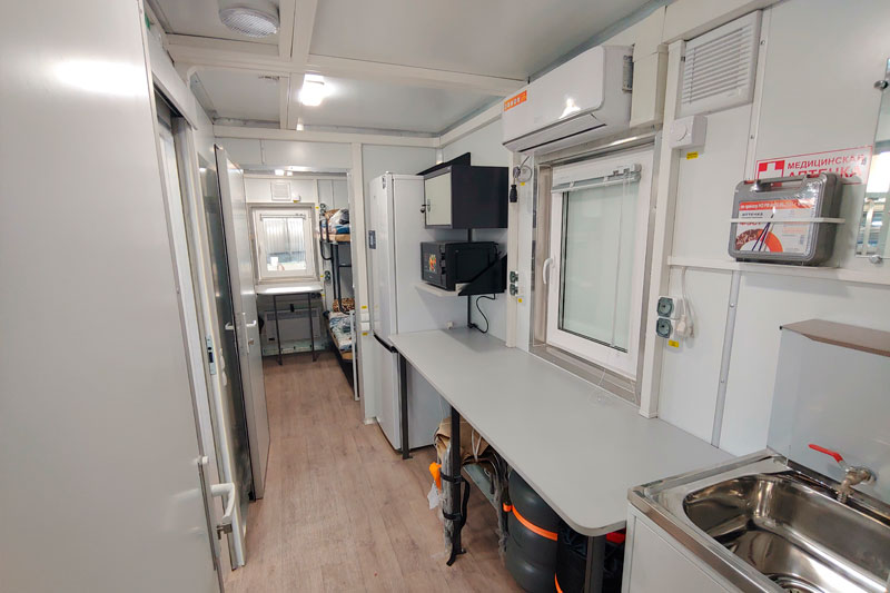 КУХНЯ: холодильник, стол, умывальник с подогревом воды и мойкой, микроволновая печь, сейф, кондиционер.
