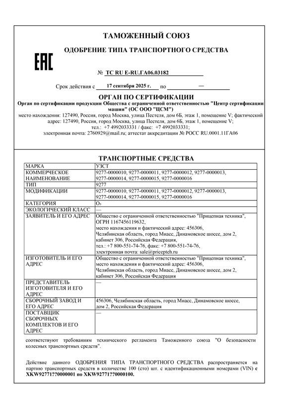 | ТС RU Е-RU.ГА06.03182 | Прицеп грузовой | 9277-0000010 |