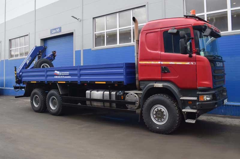 6х6, 480 л.с., коробка передач 12-ступенчатая, спальное место, длина платформы 6,7 м, КМУ: грузовой момент 8,5 тм, вылет стрелы 8,25 м, г/п 4 т., 2 секции телескопирования