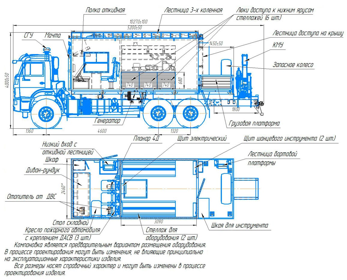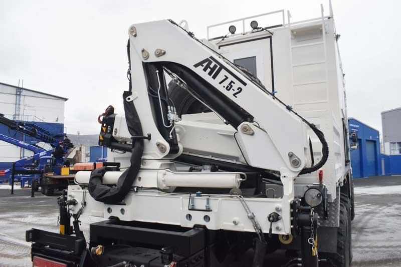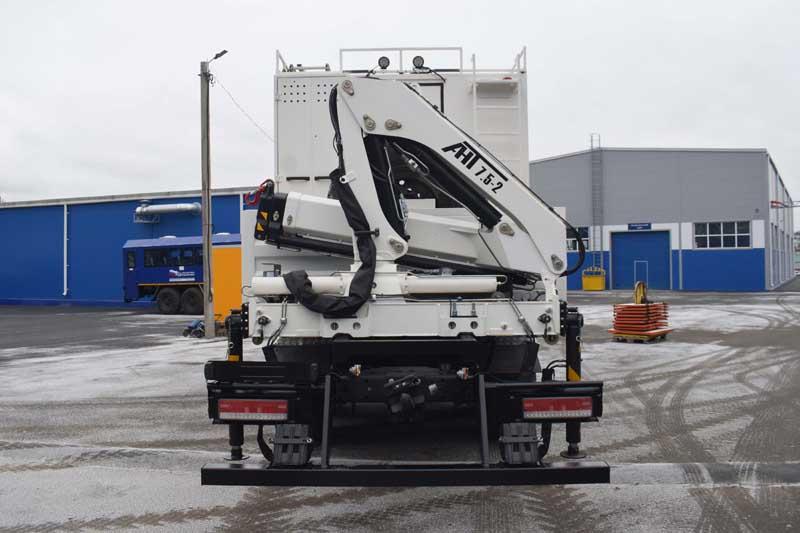 6х6, 300 л.с., коробка передач Камаз-154, спальное место, каркасно-металлический фургон, бортовая платформа. Пассажирский отсек: 4 сиденья, 2 спальных места, стол, 2 шкафа, холодильник, моечный аппарат, лебедка. Макс. г/п КМУ – 4 т., 2 секции телескопирования