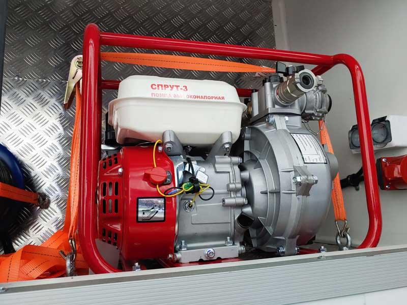 6х6, 310 л.с., коробка передач 1310T0, каркасно-металлический фургон, насос НЦПК 40/100-4/400, комплект пожарно-технического и аварийно-спасательного оборудования. Кабина боевого расчета: 4 сиденья (+2 в кабине водителя). Макс. г/п КМУ 3 т., 2 секции телескопирования, содержит высокопрочную сталь