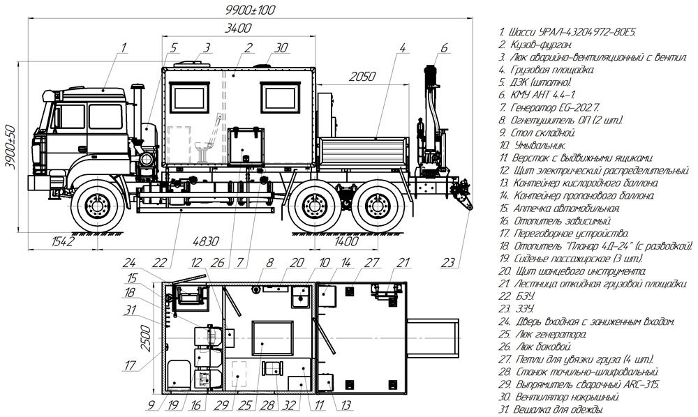 | Комплектация передвижной мастерской ПАРМ на шасси Урал 4320-4972-80Е5 с КМУ АНТ 4.4-1 | |