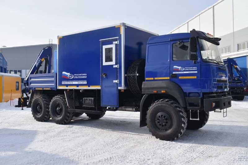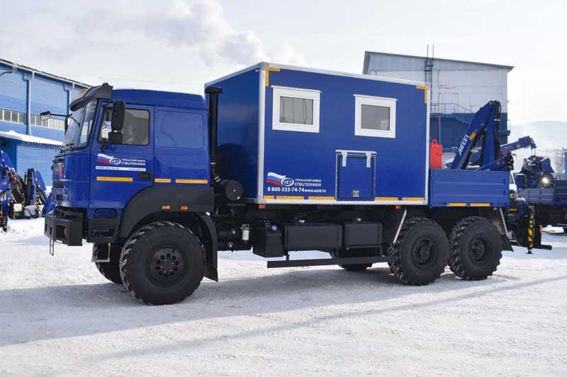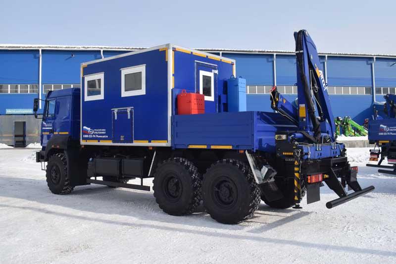 6х6, 300 л.с., коробка передач 1310ТО, без спального места, баки 210+350 л., фургон из сэндвич-панелей, бортовая платформа, генератор EG-202.6. Пассажирский отсек: 3 сиденья, стол. Технологический отсек: сверлильный станок, шлифовальный станок, сварочное оборудование, верстак. КМУ АНТ 12-2: г/п 6 т., 2 секции телескопирования, возможно дооборудование сертифицированной люлькой для проведения высотных работ