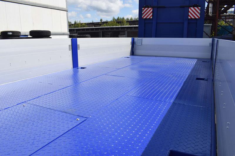 2 оси, грузоподъемность 10 т., оси HJ (BPW), рессорно-балансирная подвеска HJ (BPW), 3 пары стоек высотой 1000 мм, шины 385/65R22,5, длина погрузочной платформы 6000 мм, высота бортов 750 мм