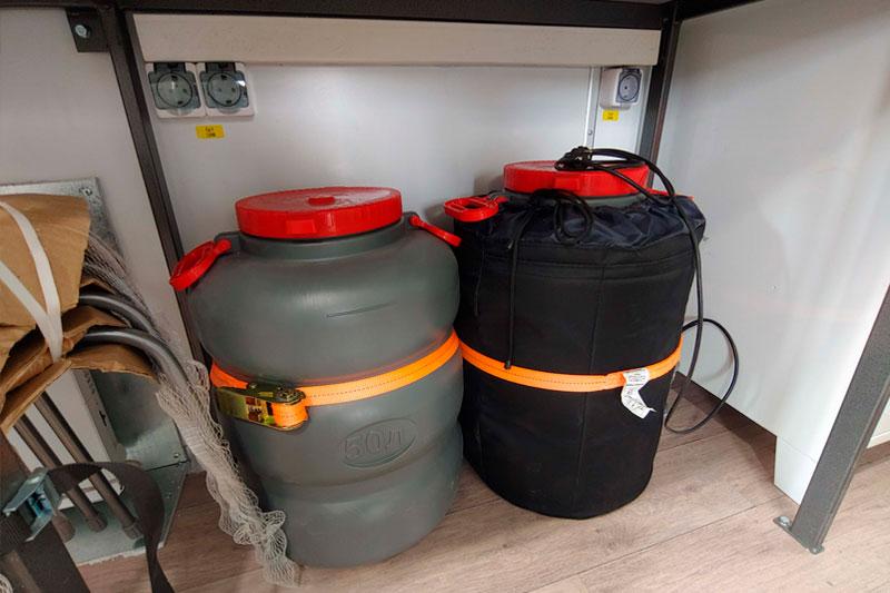 Важно: Канализация с подогреваемым патрубком (диаметр 50 мм) для эксплуатации в холодное время года. Система включает наружный бак для стоков на 50 литров с утепляющим чехлом -