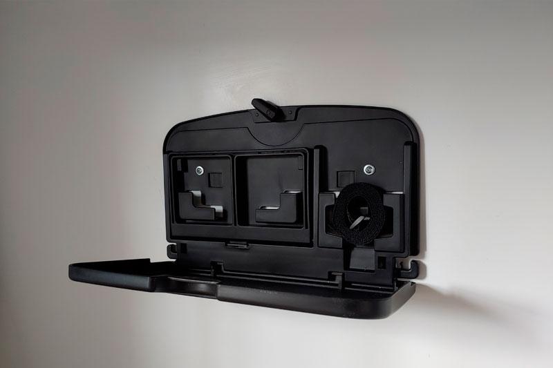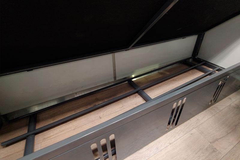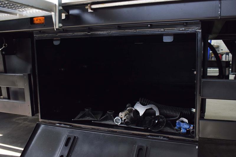 Регулируемая металлическая лестница-площадка. На время перевозки удобно размещается в подпольном рундуке.