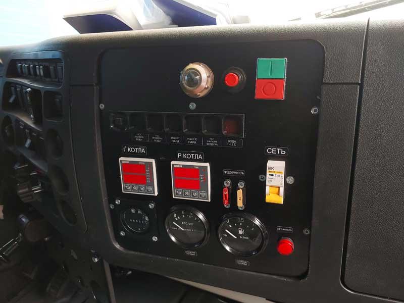 6х6, 283 л.с., коробка передач ЯМЗ-1105, без спального места, баки 300+210 л., насос Kopper Pump PL-60, производительность 1600 кг/ч | 100 кгс/см², каркасно-металлический фургон, бак запаса воды 5,2 м³, 2 топливных бака по 0,32 м³, пульт управления установкой в кабине