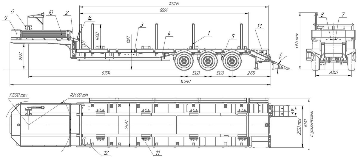 грузоподъемность 39 т., 1-скатная ошиновка, оси HJ (аналог BPW) (1 ось подъемная), пневматическая подвеска HJ (аналог BPW), 5 пар обрезиненных коников высотой 1500 мм, шины 385/65R22,5, длина погрузочной платформы 11397 мм, передний борт 1600 мм, высота ССУ 1550 мм, алюминиевые приставные трапы, бортовая платформа, откидная боковая защита