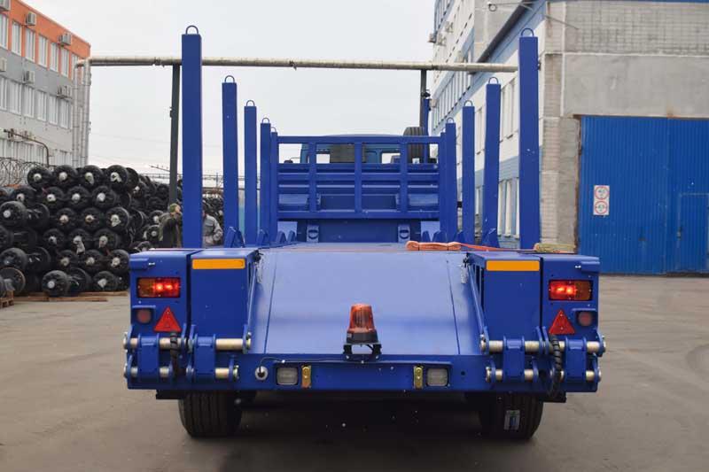 грузоподъемность 39 т., 1-скатная ошиновка, оси HJ (аналог BPW), пневматическая подвеска HJ (аналог BPW), 4 пары обрезиненных стоек высотой 1500 мм, шины 385/65R22,5, длина погрузочной платформы 10300 мм, передний борт 1600 мм, высота ССУ 1500 мм, механические трапы, откидная боковая защита