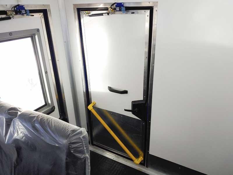 С правой стороны, с глухим окном, заниженный вход, поручень. Подсветка входа, замок. Уплотнитель на алюминиевой основе со сменными лепестками из эластичной резины. Откидная лестница входной двери. |
