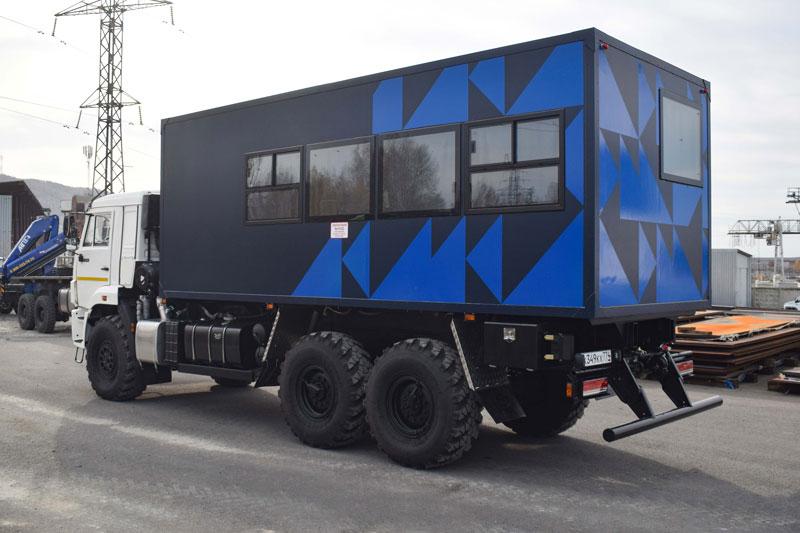 6х6, 300 л.с., коробка передач Камаз-154, без спального места, баки 210+350 л., мест в фургоне – 28 (+2 в кабине), двойные однокамерные вклеиваемые стеклопакеты из закаленного травмобезопасного стекла, фургон из сэндвич-панелей, багажные полки, сиденья повышенного комфорта, видеонаблюдение в салоне, категория D, комплектация "Антициклон"