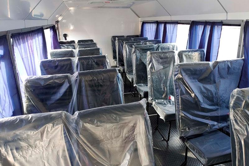 Все вахтовые автобусы производства «Уральского завода спецтехники» имеют двойные однокамерные вклеиваемые стеклопакеты из закаленного травмобезопасного стекла.